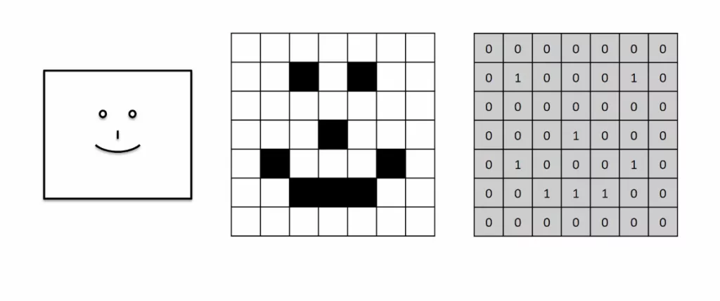 Voilà une manière de comment l’ordinateur voit une image. Pour faire simple il n’y a pas de nuance dans les futurs exemples, c’est soit blanc donc 0 soit noir 1.
