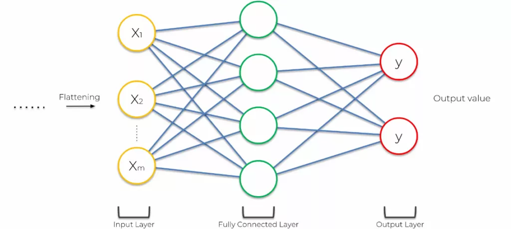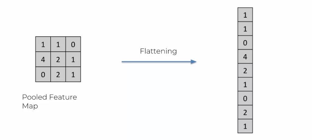 Comme nous l’avions vu précédemment, un réseau de neurone connecté, les couches d’entrées, cachées, et de sorties sont verticales. Jusqu’à maintenant, nous avions une image représentée par des carrés. Nous avons diminué la taille de l’image. Le Flattening permet de verticaliser les pooled feature map.