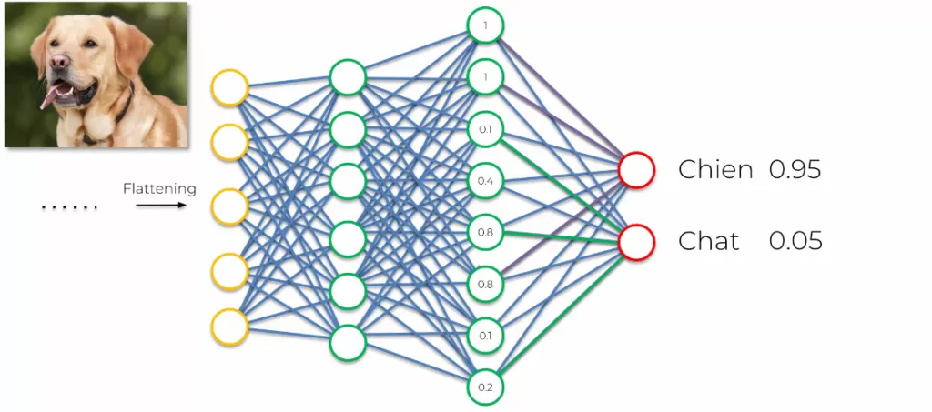 Le réseau est autoapprenant en supervision, ce qui signifie que si nous montrons une image de chien et que le réseau dit chat, alors nous indiquons au réseau qu’il a faux. Ainsi, il va se réajuster lui-même en modifiant ses paramètres pour éviter la même erreur.