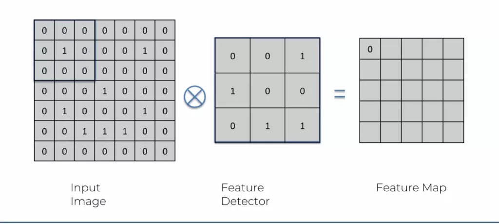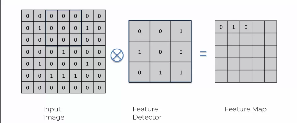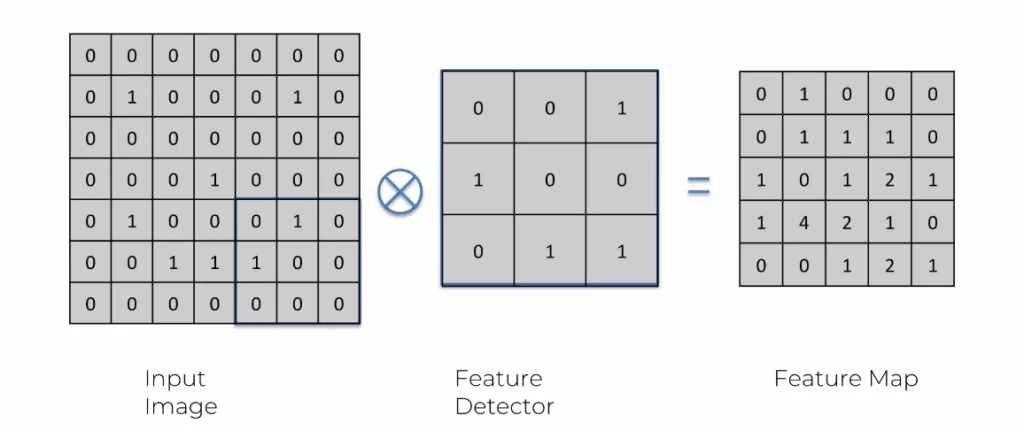 Pour la convolution, il suffit de reprendre l’image pixelisée, carré par carré, et de la « convertir » avec une sorte de « calque ». Oui, j’utilise beaucoup de guillemets, car aucun de ces termes sont utilisés. Le calque s’appelle un feature detector et l’image convertie se nomme feature map. Il existe des millions de feature detector différents et de taille différente, le choix se fait en fonction des best practice des data scientist. Une fois que l’image est intégralement passée par un feature detector, on obtient une feature map. C’est l’image originale, compressée une nouvelle fois avec un calque précis.