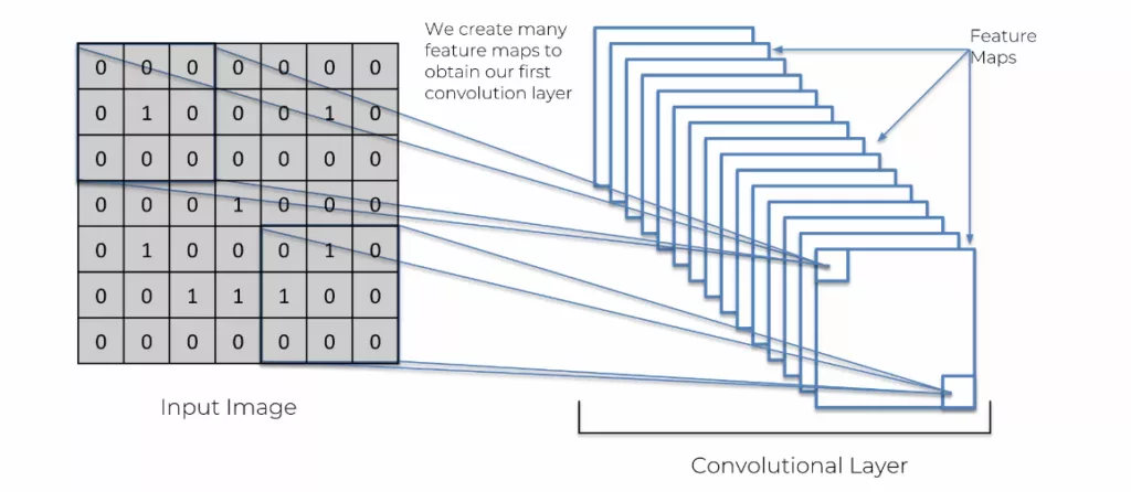 Nous répétons ce processus avec d’autres feature detector pour créer plusieurs feature map de cette image. Cela va créer une sorte de mille-feuilles de plein de feature map différentes. On appelle cela une couche de convolution.
