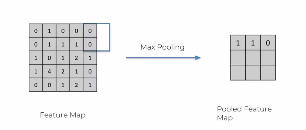 On passe la feature map dans un max pooling (ici d’un carré de 2 par 2) où l’on va garder par exemple que les chiffres les plus grands. L’image encore réduite s’appelle un pooled feature map.