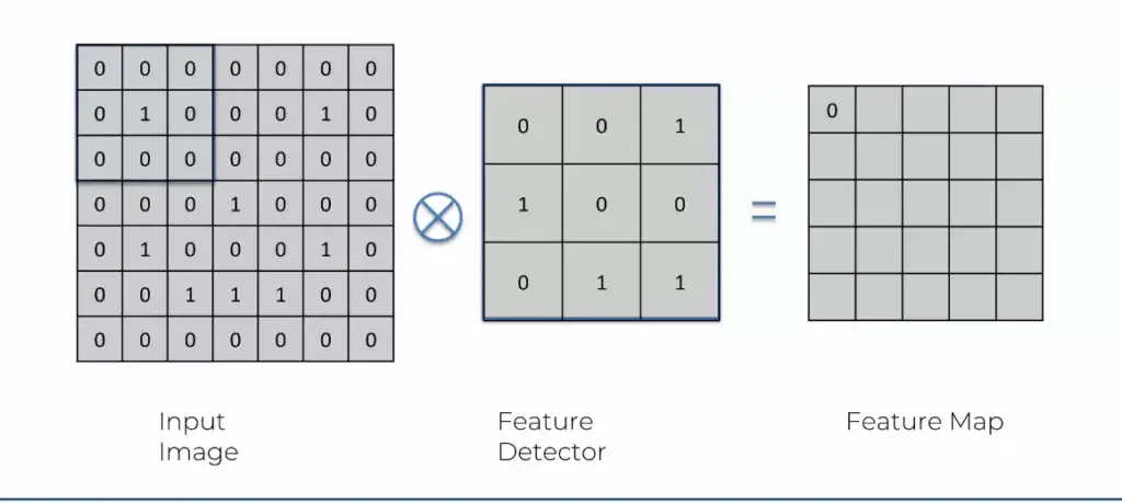 Pour la convolution, il suffit de reprendre l’image pixelisée, carré par carré, et de la « convertir » avec une sorte de « calque ». Oui, j’utilise beaucoup de guillemets, car aucun de ces termes sont utilisés. Le calque s’appelle un feature detector et l’image convertie se nomme feature map. Il existe des millions de feature detector différents et de taille différente, le choix se fait en fonction des best practice des data scientist. Une fois que l’image est intégralement passée par un feature detector, on obtient une feature map. C’est l’image originale, compressée une nouvelle fois avec un calque précis.