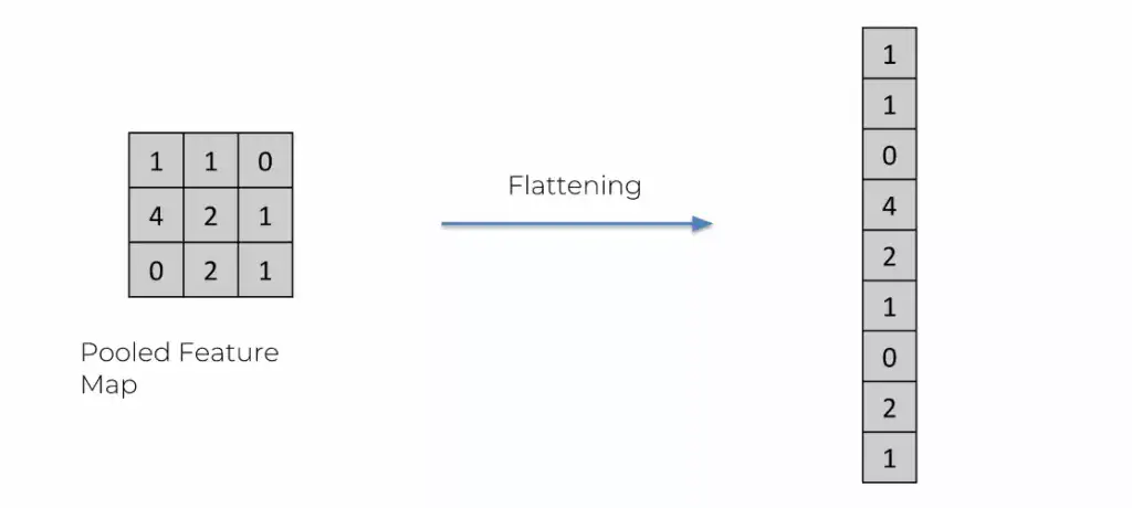 Comme nous l’avions vu précédemment, un réseau de neurone connecté, les couches d’entrées, cachées, et de sorties sont verticales. Jusqu’à maintenant, nous avions une image représentée par des carrés. Nous avons diminué la taille de l’image. Le Flattening permet de verticaliser les pooled feature map.